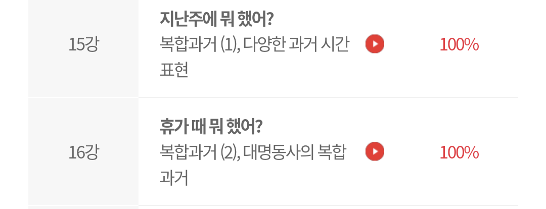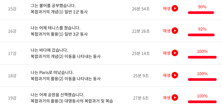 소피 선생님 5강의, 엠마 선생님 2강의, 지니 선생님 2강의, 클라라 선생님 5강의. 총 14강의에 걸쳐 수업을 듣고 나니 복합과거가 더 이상 어렵게 느껴지지 않는다.