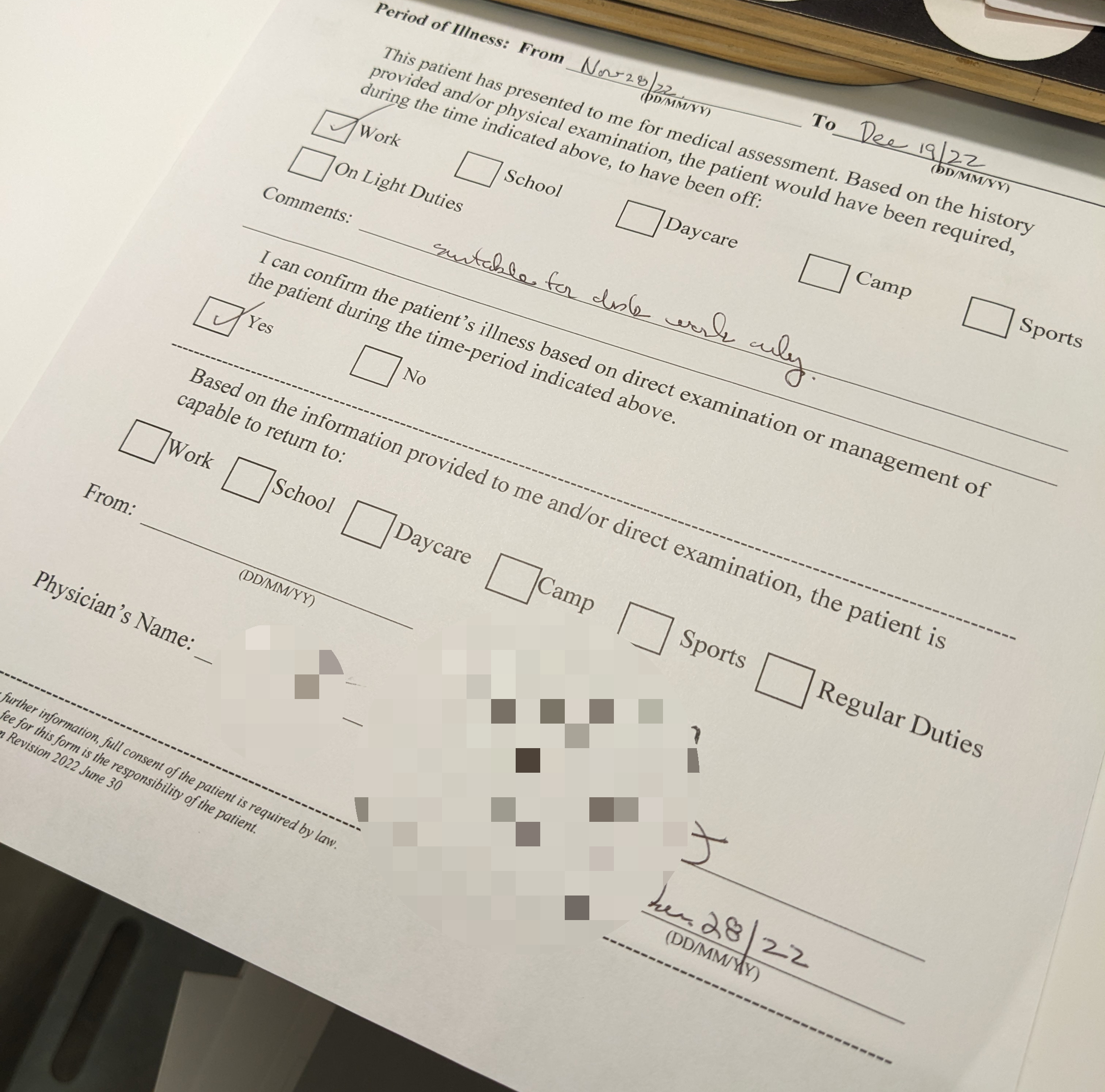 (medical certificate for EI sickness benefits도 필요하다고 홈페이지에 적혀있어서 프린트를 해서 갔는데 의사분이 본인은 이것을 써주지 않는다고 하셨다. 대신 진단서를 받아서 왔고 그것 만으로도 EI승인이 되었던 것을 보면 굳이 필요한 서류는 아닌듯 하다)